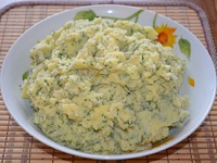 4.В готовое пюре добавляем пассированный лук, укроп, 50г сливочного масла, 100мл молока.