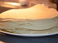 8.Вырезаем кружочки нужного Вам размера. Я вырезала блюдцем,диаметр которого 18см. Круглые тонкие заготовочки складываем на тарелку,не забываем присыпать мукой между ними,что бы не слиплись ( я забыла про муку, и последние 5 штук у меня сцепились намертво,не повторяйте мою ошибку :)