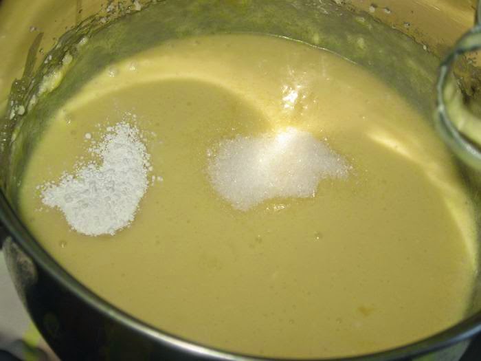 В готовую смесь добавить разрыхлитель и ванильный сахар.