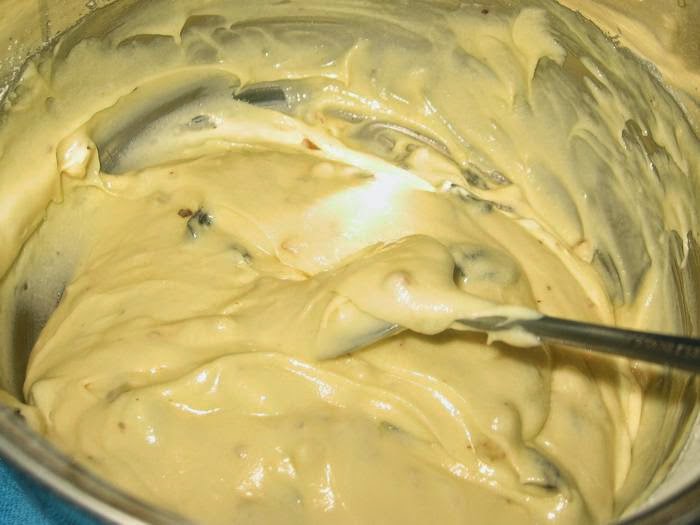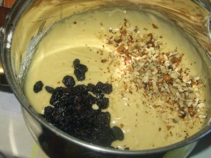 Потом добавить хорошо промытый изюм и нарезанные орехи.