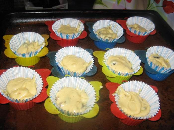 Разложить по формочкам. Я вставила в формочки бумажные формочки, чтоб не возиться со смазыванием.
