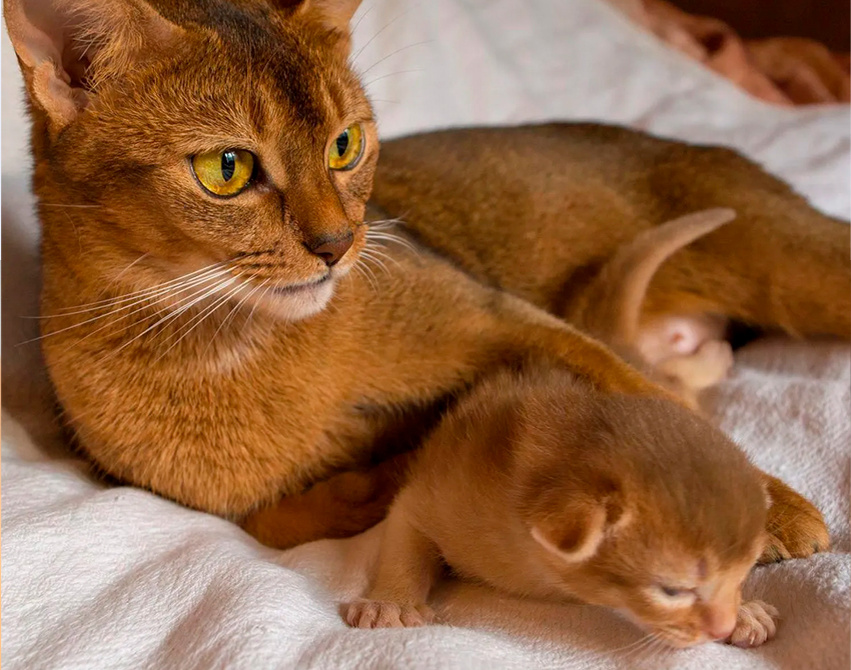 Абиссинский кот проявляет особенный родительский инстинкт, подобный самке, что проявляется во внимании и заботе к потомству. Срок беременности у кошки составляет порядка 63 – 65 дней, а сами роды проходят без проблем. Если владельцу не планируется разведение кошек, то рекомендуется стерилизовать кошку до первой течки, примерно через полгода, в этот же срок необходимо выполнить кастрацию кота.