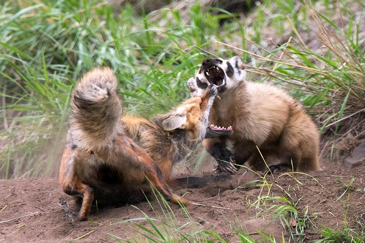 Да, в нём всего 6-15 кило веса. Но ярости на целую тонну! Столкнувшись с крупным хищником лоб в лоб, барсук рассуждает согласно старой мудрости: лучшая защита — это нападение. Визави поехавшего зверя могут стать и койоты, и стая волков, и даже гризли! Слабоумие и отвагу подкрепляют дары матушки-природы. Кожа, толщиной в полсантиметра, защищает барсука от когтей и зубов. Для сравнения: самые жесткие участки дермы у человека на ступнях и ладонях достигают толщины до 3 мм. Шкура не только прочная, но и эластичная. Она болтается складками. Схватить и обездвижить барсука — почти нереально.