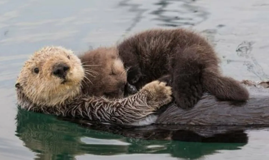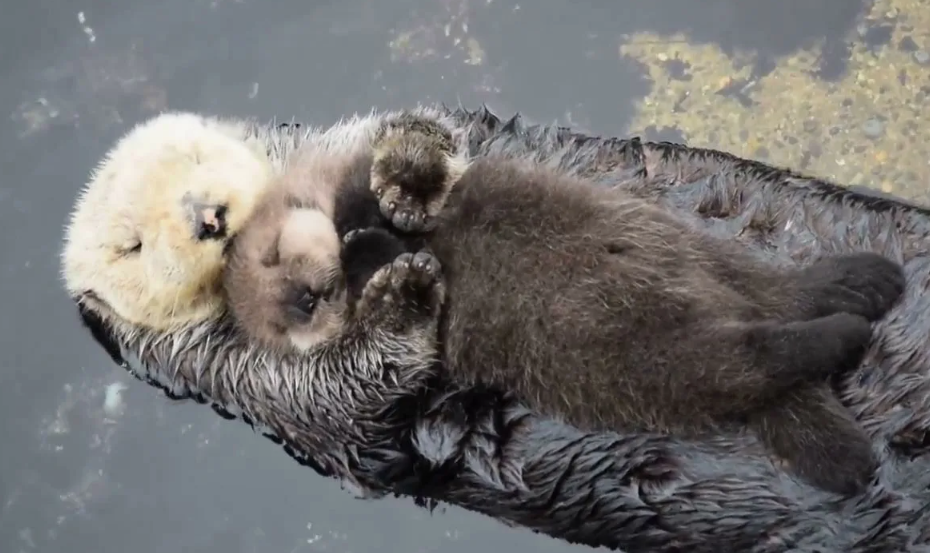Забота: мать носит детёныша на груди, пока охотится, оставляет его на поверхности, обвязывая водорослями, чтобы не унесло течением.