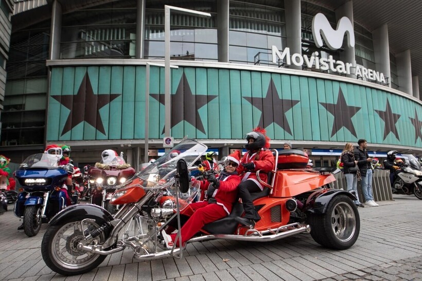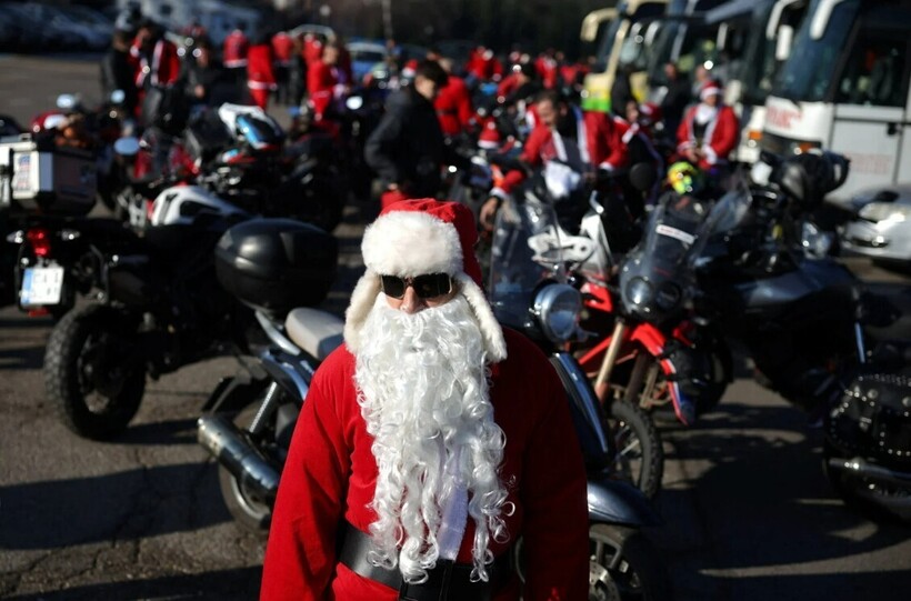 В болгарской Софии байкер в костюме Санта-Клауса стоит у своего мотоцикла