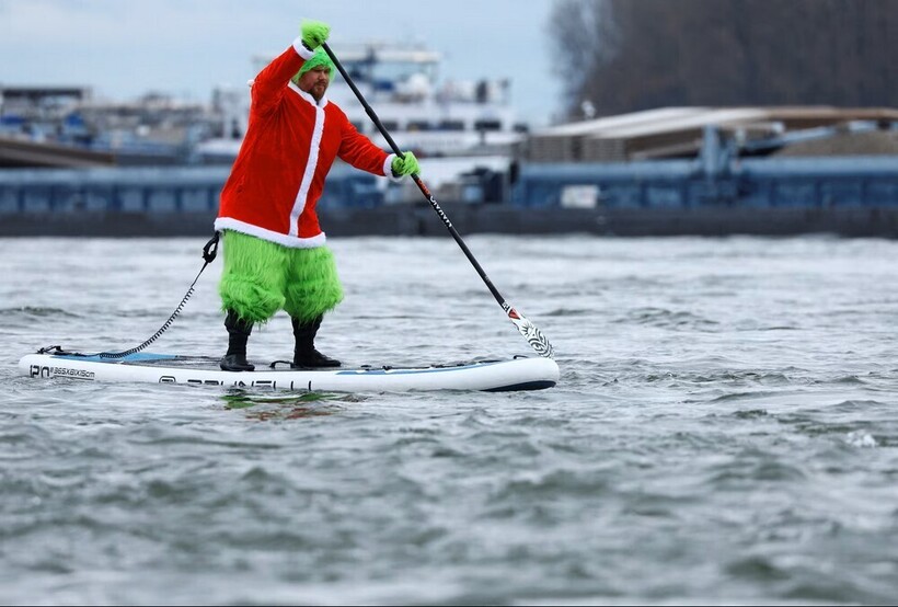 В немецком Монхайме участник клуба водных видов спорта плывет на сапборде по Рейну