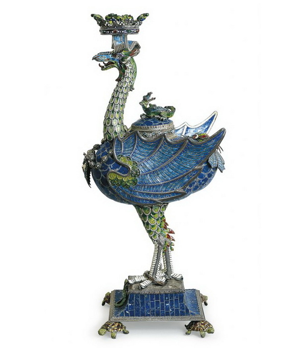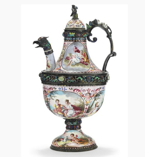 Серебряный кофейник с носиком в виде головы феникса, украшенный позолотой и эмалью, высота 20 см, фирма Германа Бёма, Вена, конец XIX века.