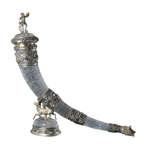 Серебряный рог изобилия, поддерживаемый крылатым гиппокампом, украшенный позолотой и эмалью, Австрия, конец XIX века.