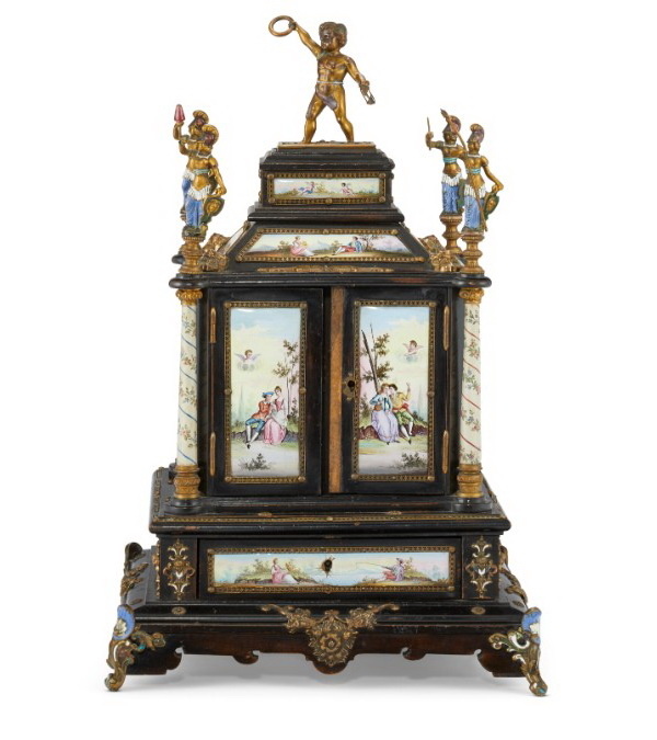 Настольный кабинет из черного дерева с эмалевыми вставками аллегорической тематики, увенчанная серебряными позолоченными фигурками, высота 42 см, Вена, около 1880-1900 гг.
