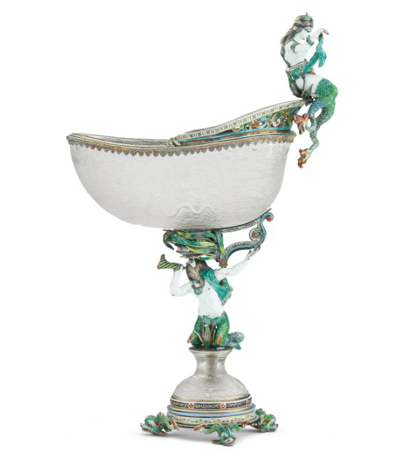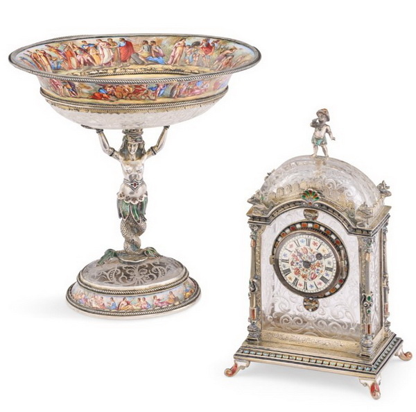Настольные часы из горного хрусталя с гравированными узорами в серебряной оправе с эмалями и серебряная тацца фирмы Германа Ратцендорфера, украшенная живописными эмалями, поддерживаемая русалкой на хрустальном гравированном куполе, Вена, последняя четверть XIX века.