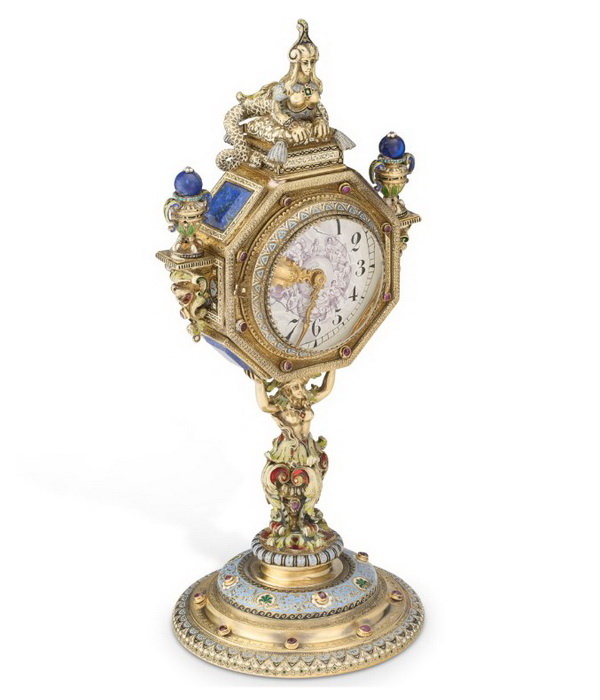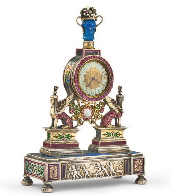 Часы, увенчанные сфинксом, из серебра с эмалями и лазуритом, высота 18 см, фирма Карла Рёсслера, Вена, около 1890 г.