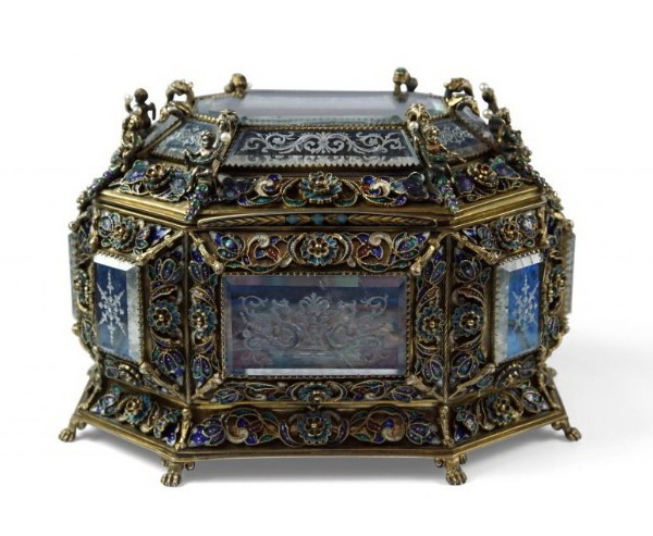 Серебряный ларец со вставками из гравированного хрусталя, украшенный эмалями, фирма Германа Бёма, длина 17 см, Вена, около 1880 г.