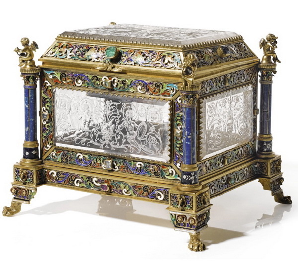 Серебряный ларец со вставками из гравированного хрусталя, украшенный эмалями, лазуритом и полудрагоценными камнями, фирма Германа Бёма, длина 19,5 см, Вена, около 1880 г.