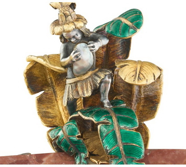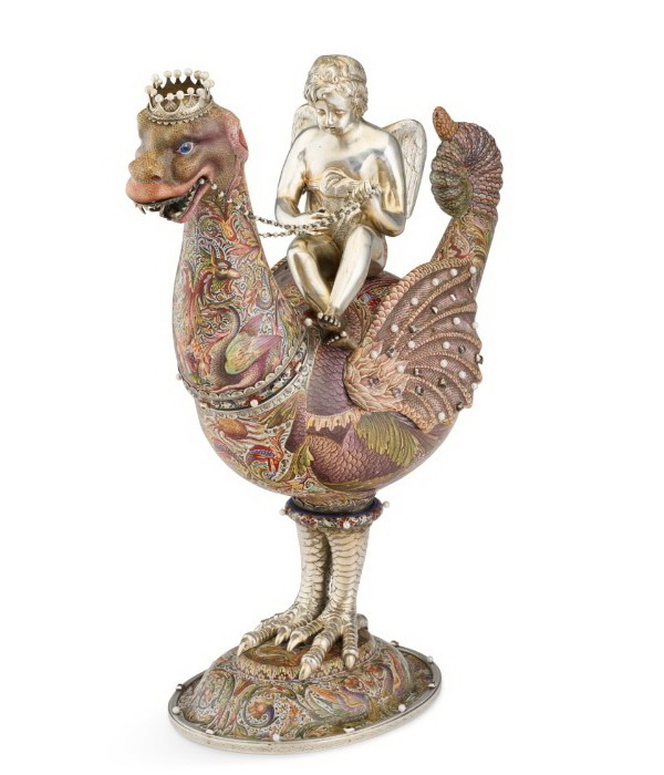 Фигурка пути из серебра верхом на спине фантастического существа с головой дракона и телом петуха, украшенного эмалями и жемчугом, марка «KB» (возможно, Карл Бём), высота 38 см, около 1890 г.