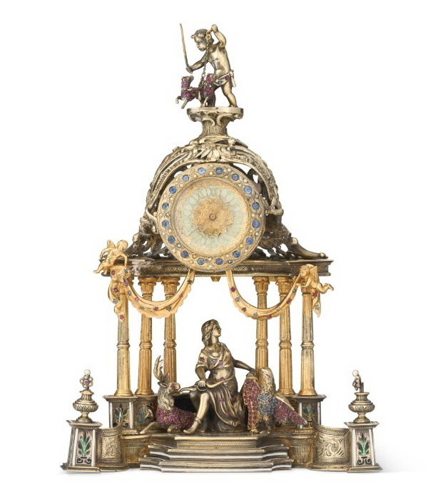 Настольные часы в виде ротонды с фигуркой Дианы в окружении оленя и орла из серебра с эмалями и драгоценными камнями, высота 26,4 см, Вена, около 1880 г.