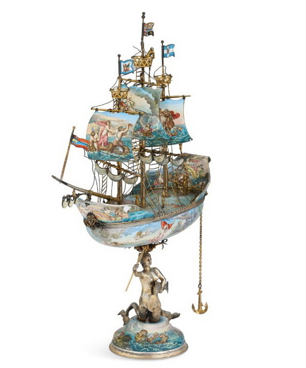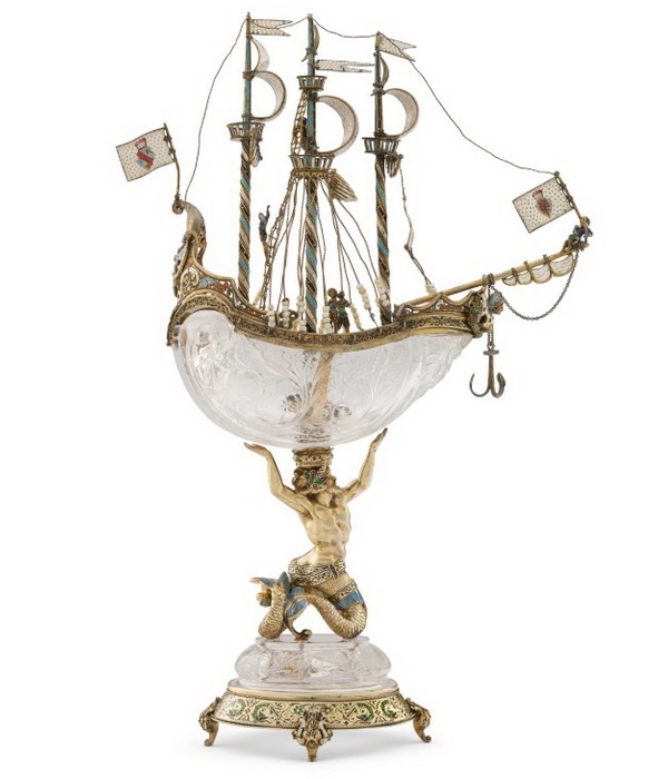 Неф (настольное украшение в виде корабля) по дизайну Йозефа фон Шторка, позолоченное серебро с эмалями, Австрия, последняя четверть XIX века.
