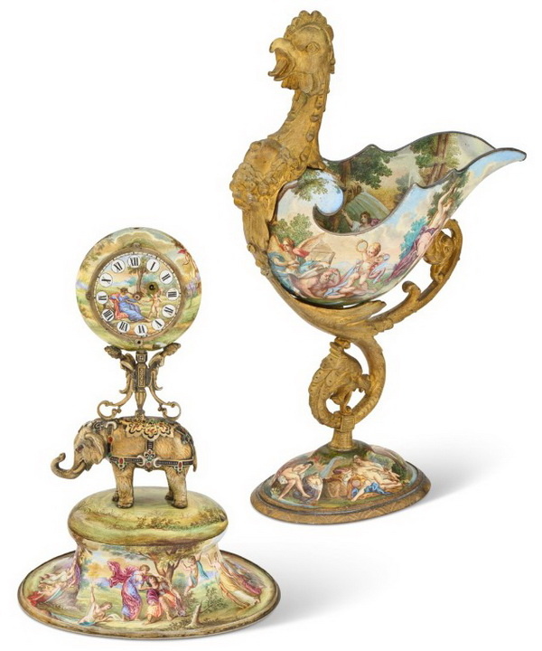 Часы с фигуркой слона и чаша в виде петуха из серебра с эмалями, Австрия, последняя четверть XIX века.
