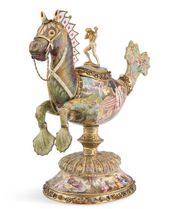 Кубок в виде гиппокампа из серебра с эмалями, высота 34 см, фирма Рудольфа Линке, Вена, около 1890 г.