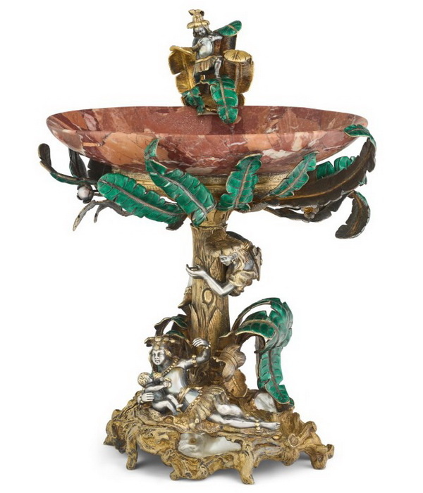 Эта чаша, поддерживаемая серебряной пальмой с фигурной сценкой у основания, считается работой австрийских мастеров конца XIX века, высота 28 см.