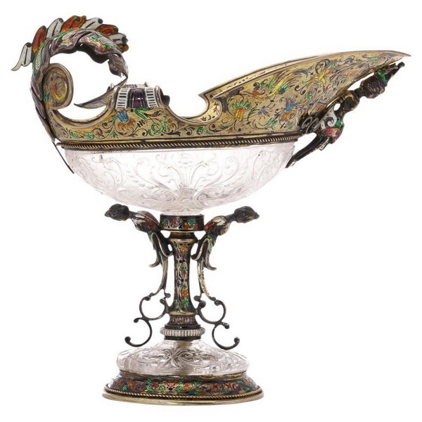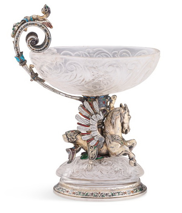 Чаша из гравированного хрусталя, поддерживаемая крылатым гиппокампом, оправа из позолоченного серебра с эмалями, высота 17 см, Вена, вторая половина XIX века.