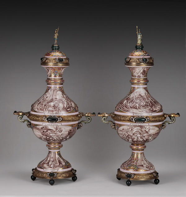 Пара серебряных ваз с позолотой, эмалью и полудрагоценными камнями, расписанных античными сюжетами, крышки ваз увенчаны фигурками Минервы и Марса, Австрия, конец XIX века.