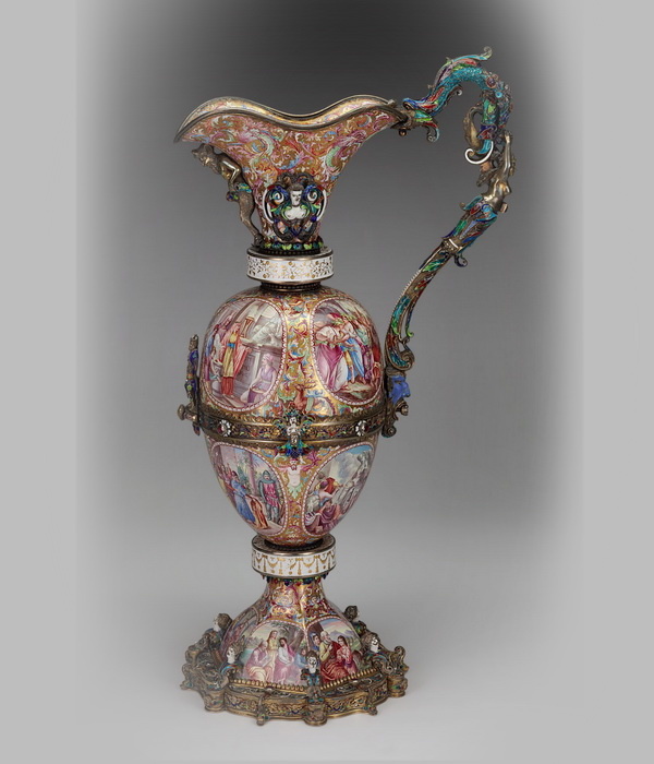 Серебряный кувшин с ручкой в виде дракона, украшенный позолотой и эмалью, Австрия, конец XIX века.