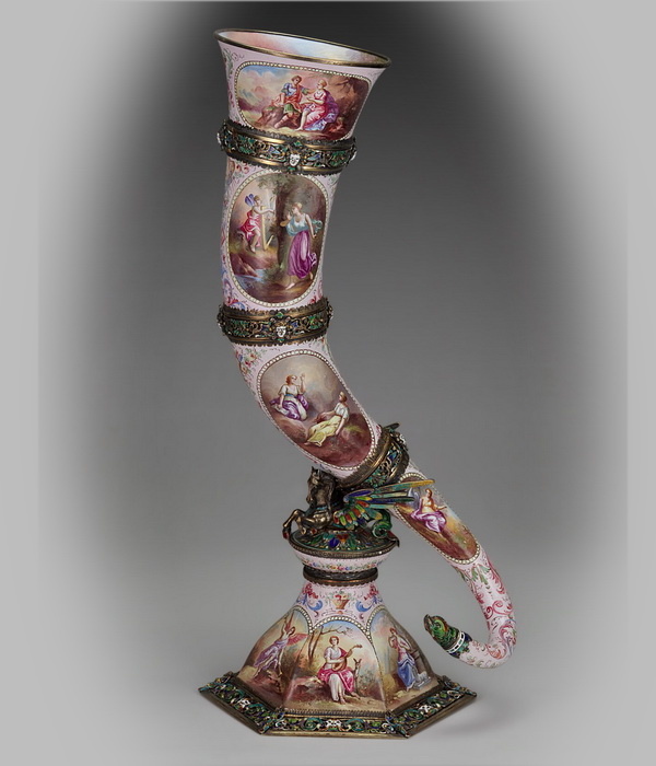 Хрустальный рог изобилия в оправе из серебра с эмалями, марка «KB» (возможно, Карл Бём), из коллекции Фонда Медейроса и Алмейды, Лиссабон, последняя четверть XIX века.