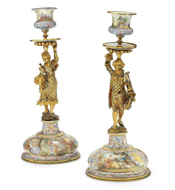 Пара фигурных позолоченных подсвечников, украшенных эмалями, высота 21 см, Вена, конец XIX века.