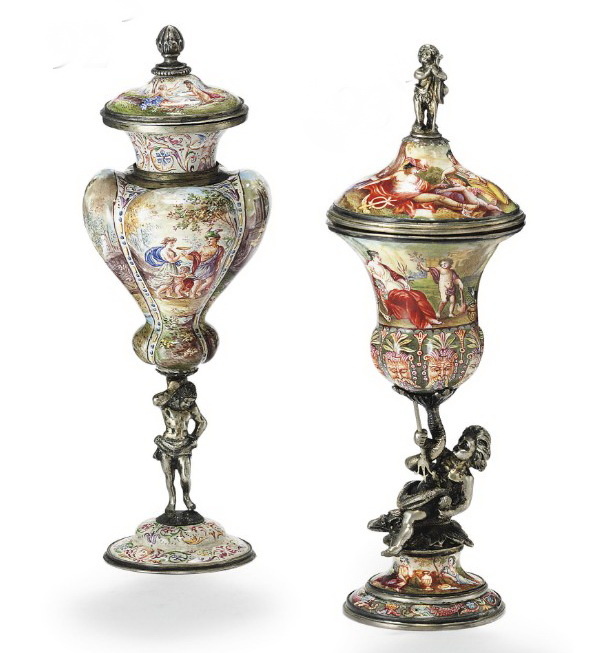 Пара серебряных кубков с крышками на фигурных ножках, украшенных эмалями, высота 16 см, Вена, конец XIX века.