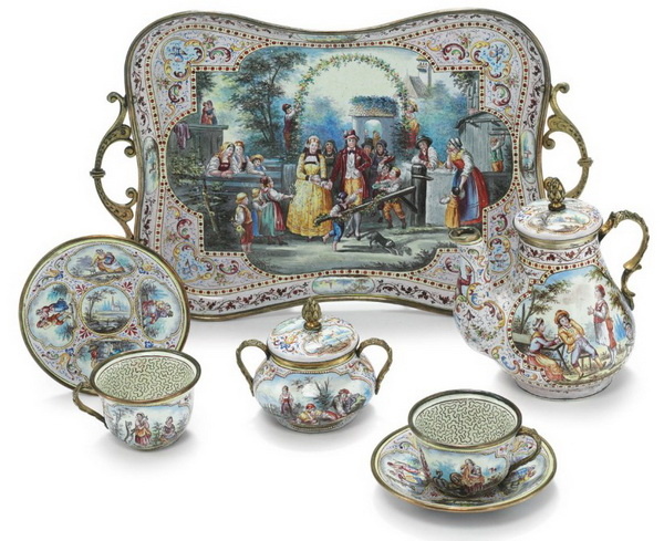 Серебряный сервиз, украшенный эмалями, центр подноса расписан сценой сельской свадьбы, фирма Людвига Политцера, Вена, около 1890 г.