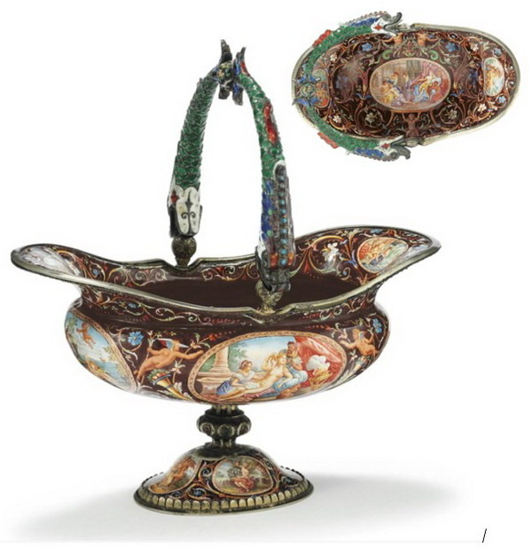 Вазочка для фруктовых десертов, украшенная эмалями, длина 9,5 см, Вена, конец XIX века.