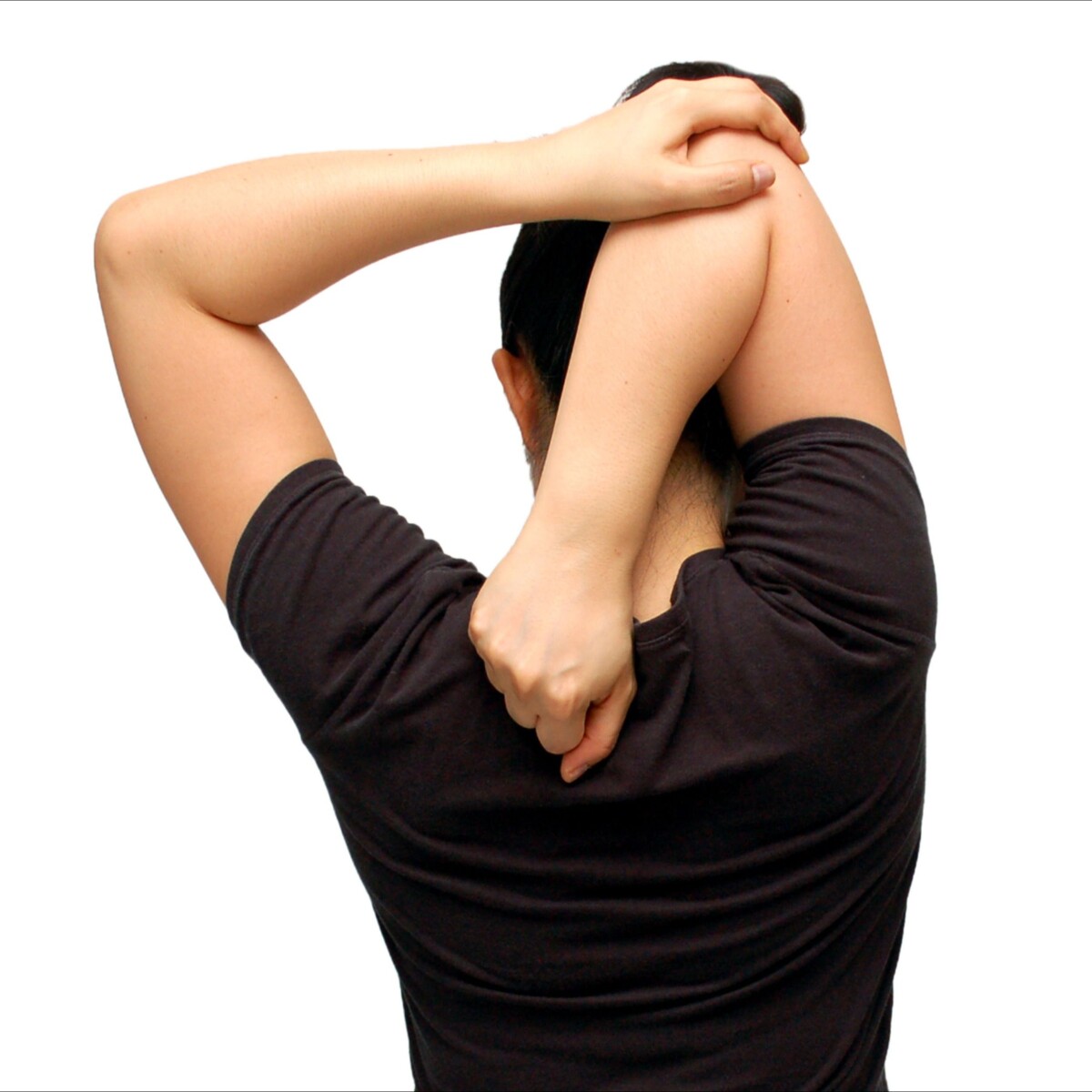 Правая рука заводится за голову, локоть смотрит вверх, а ладонь опускается на спину между лопаток. Левой рукой аккуратно надавите на локоть правой, чтобы усилить натяжение мышц. Задержитесь в таком положении на тридцать секунд, затем повторите для левой руки.