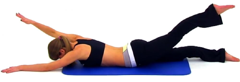 Лечь на живот. Руки вытянуть вперёд. Медленно поднять правую руку и левую ногу — удержать три секунды, опустить. Затем левую руку и правую ногу.