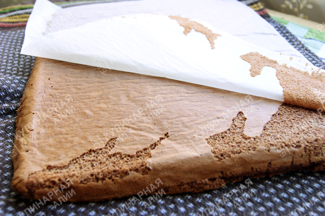 Разворачиваем наш бисквит... Вот он немножко согнулся, что и нужно было, чтобы легче было сворачивать...