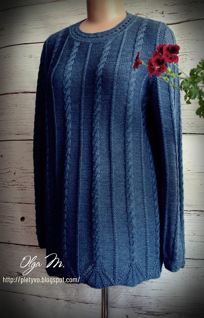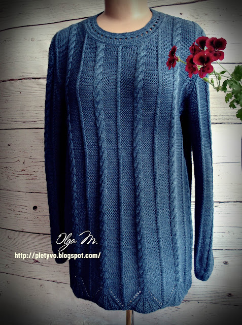Длина джемпера 70 см, ширина изделия 57 см, длина рукава от подмышки 43 см.