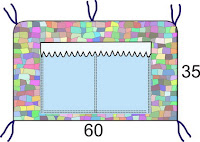 На ткани для кармана обработайте края. Загните внутрь верхний край на 1 см, отутюжьте, вложите в него резинку. Пристрочите резинку швом «зигзаг». Прикрепите на лицевую сторону кармана кружевную ленту. Разместите карман на лицевой стороне бампера. Двойной строчкой пришейте его и разделите на 2 половины. Сшейте бампер, вставляя завязки, выверните, вставьте поролон, зашейте отверстие.