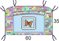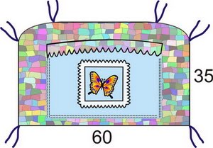 Размеры моего бампера: 60 см х 35 см – 2 шт, 120 см х 35 см– 2 шт. По этим размерам необходимо выкроить детали из поролона и ткани, не забывая про припуски на швы по 1 см с каждой стороны. Обработайте края ткани швом «зигзаг». Если у вас нет поролона (его можно купить в мебельном отделе ЦУМа), используйте синтепон. Только в этом случае нужно будет дополнительно прострочить детали в нескольких местах, чтобы он не скачивался. Заготовьте завязочки из атласной ленты по 35-40 см, обработав края. Всего необходимо сделать 25 завязок. Для украшения я использовала оборку из той же ткани, кружевную ленту, кайму, вышивку (можно использовать готовую аппликацию). Для кармана необходим прямоугольный кусок ткани 40 см х 25 см, резинка. Такую же ткань, размером около 45 см х 30 см, я использовала как фон для вышивки, чтобы картинка хорошо «читалась».