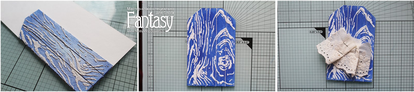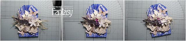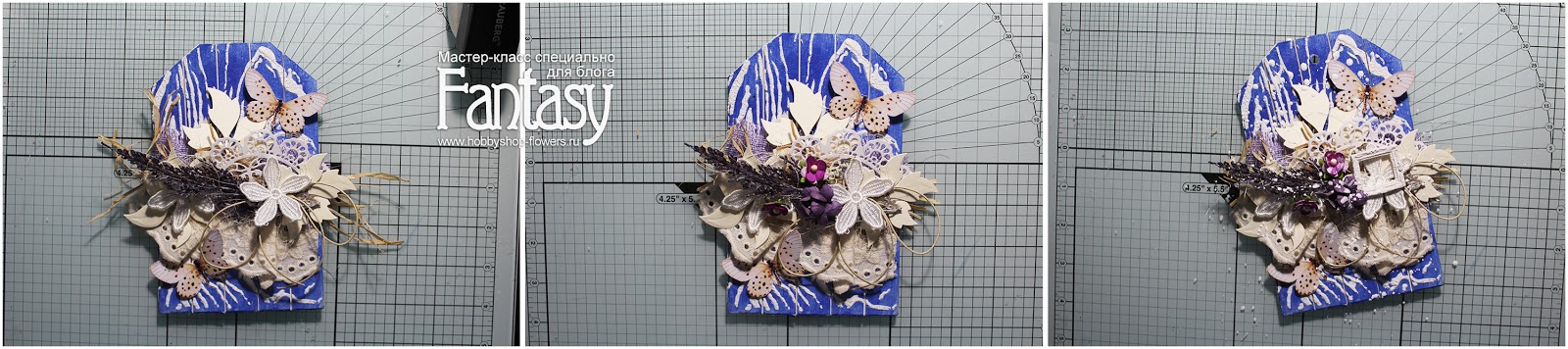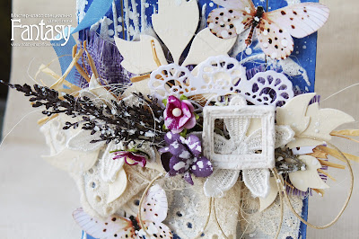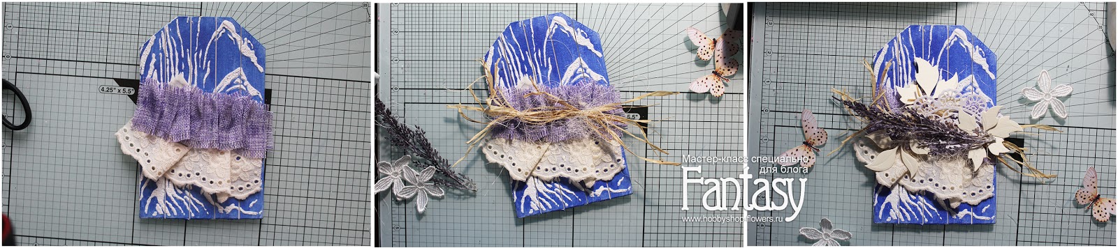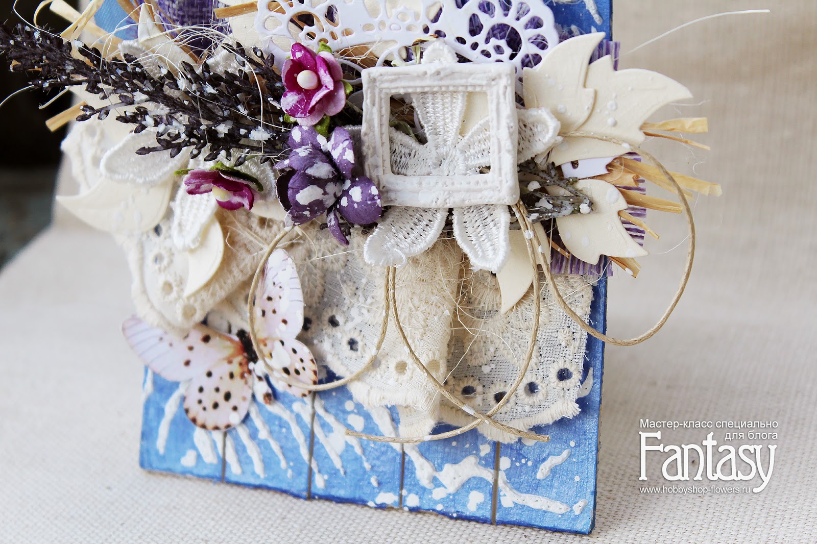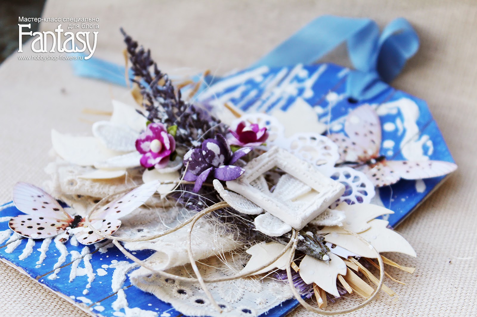 Добавляем кружево, делаем бантик из вощеного шнура, приклеиваем вырезных бабочек, остальные цветы и гипсовую рамочку. В конце всю нашу красоту обильно сбрызнем белым грунтом или акрилом..Сверху пробиваем отверстие и привязываем ленточку - тэг готов!