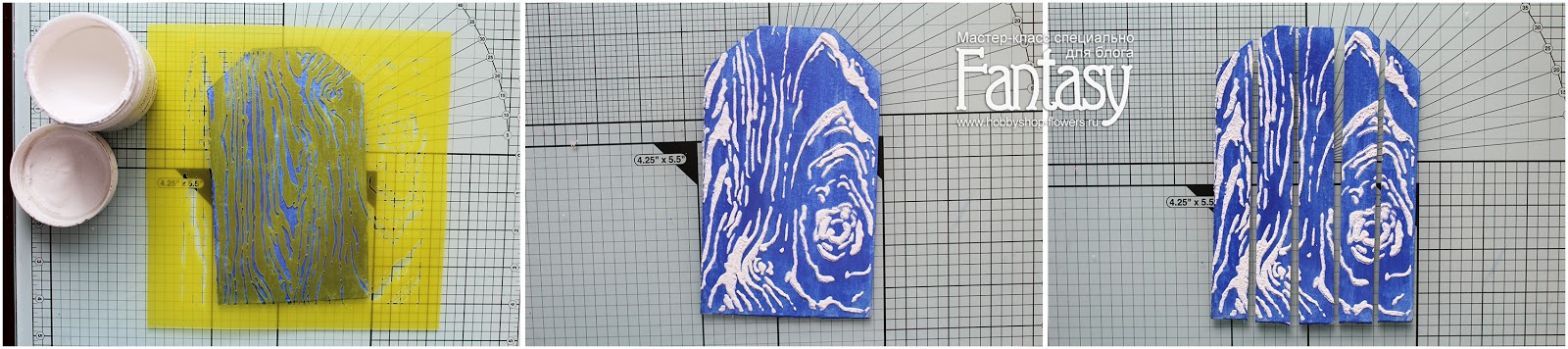 Наносим текстурную пасту с песком от ФД через трафарет с текстурой дерева.