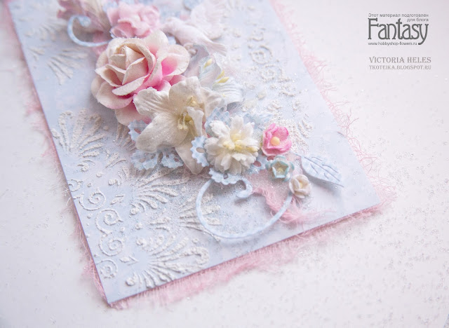 Мокрой кисточкой проходим по краям скрап-бумаги и аккуратно приподнимаем их, формируя заломы и легкие волны. Сухой кистью с белым акрилом слегка "припудриваем" цветы.
