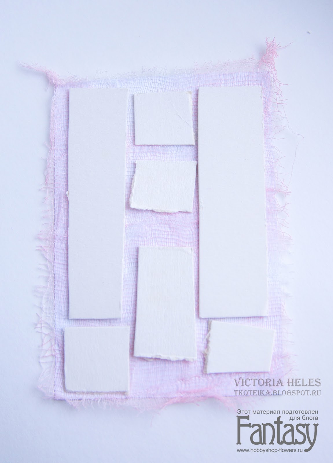 Переворачиваем фоновый лист и с изнанки прикладываем подходящий по размеру кусок покрашенной марли, размохрив края. Фиксируем несколькими капельками клея.