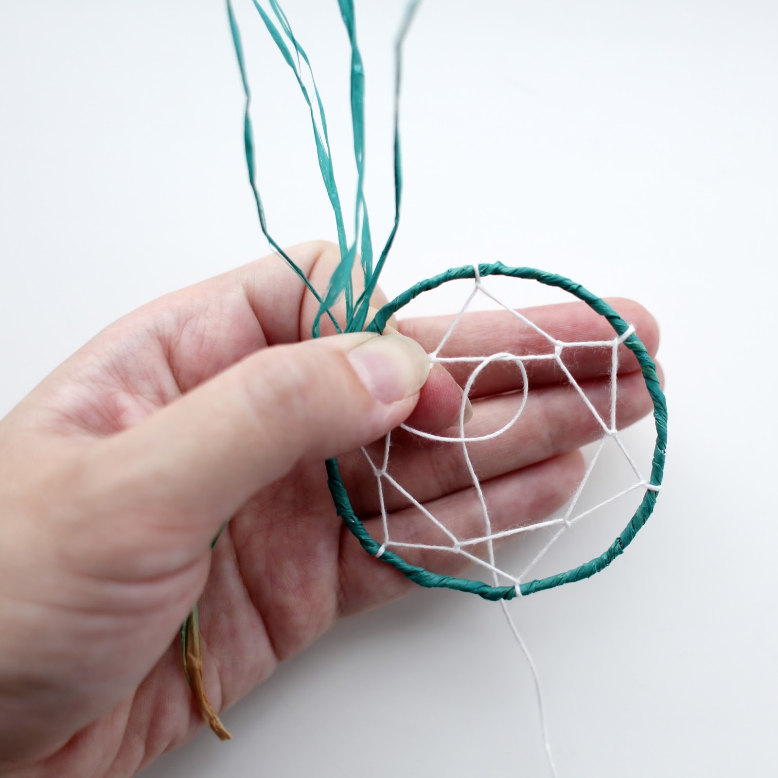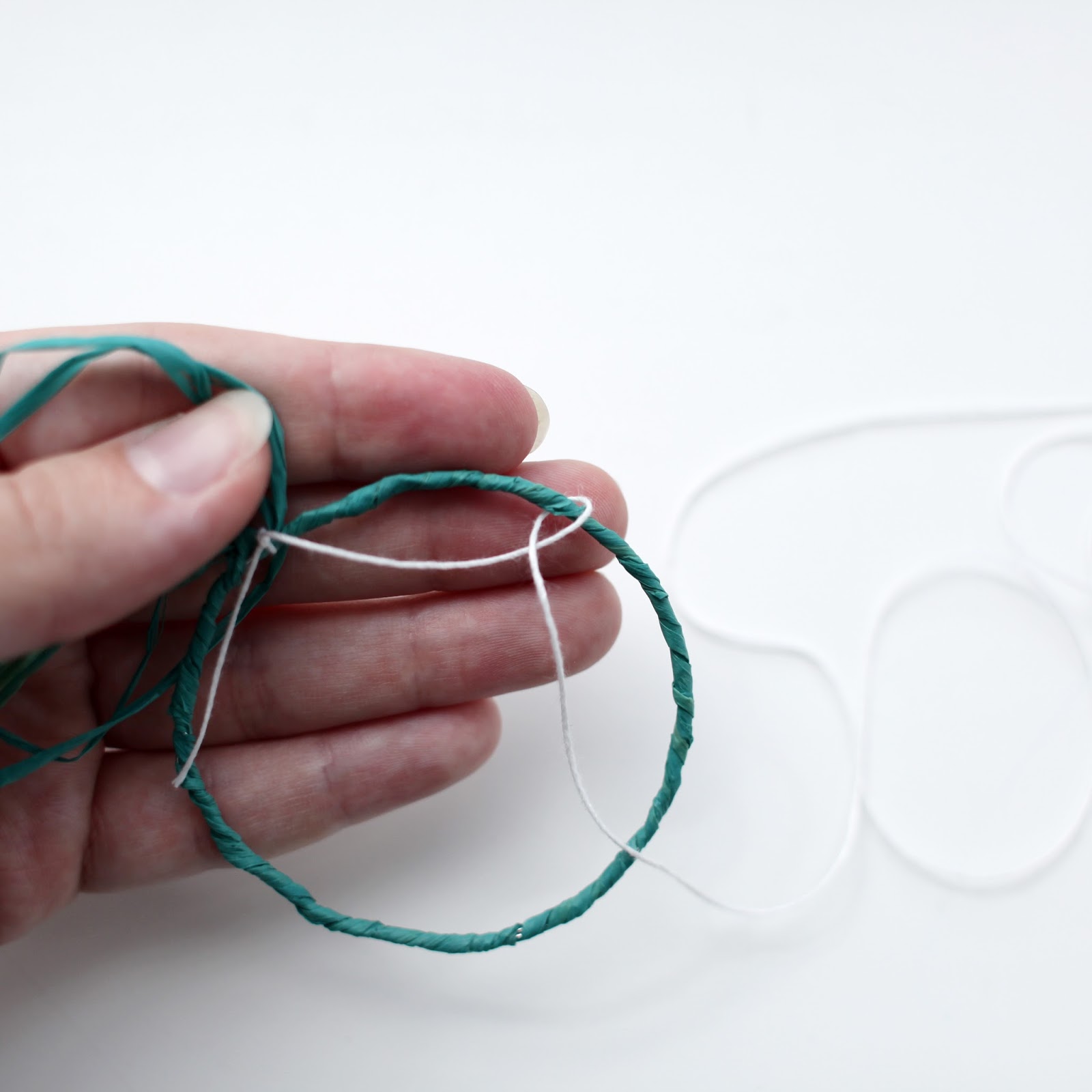 Плотно оборачиваем рафией обруч, оставив в начале небольшой отрезок для конечного узелка.