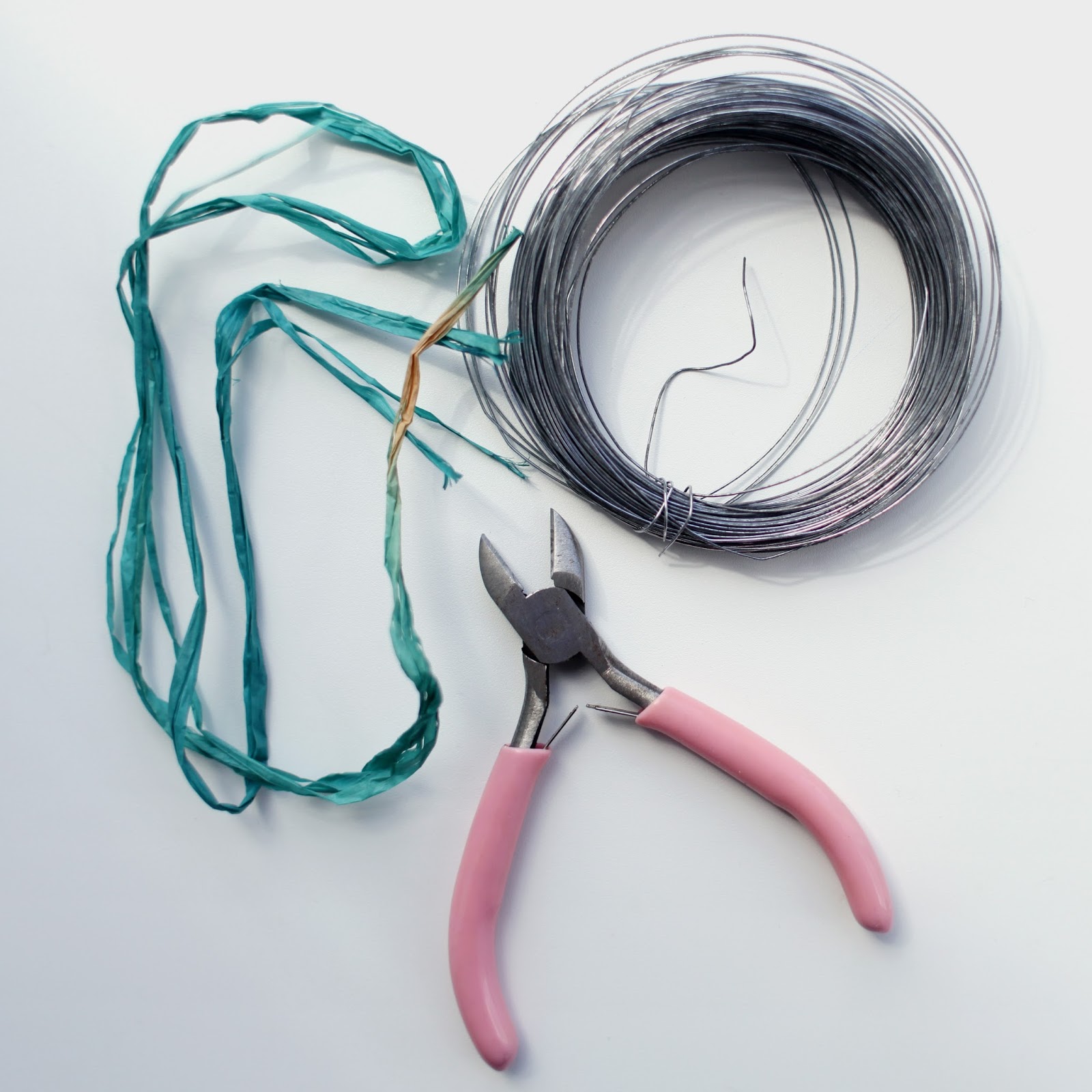 Итак, для основы нам понадобится проволока, щипцы или ножницы и шнур, тесьма или рафия, как у меня.