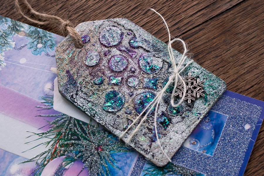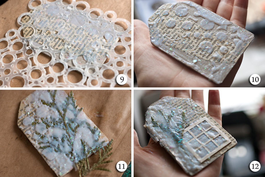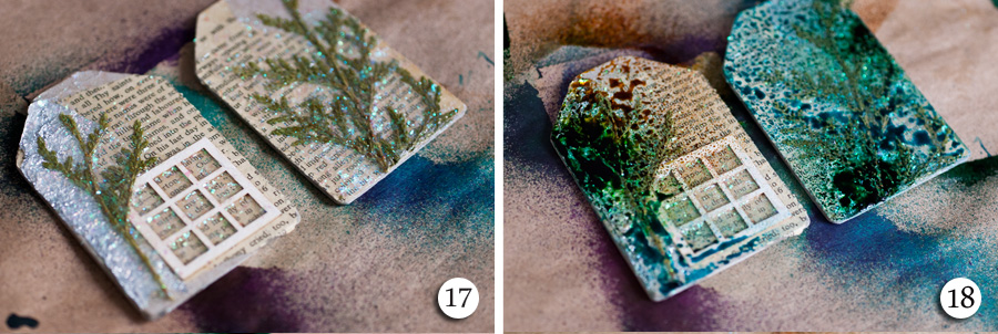 11-12. С третьим и четвертым тэгом решила поэкспериментировать - вгрунтовываю в гель веточки туи, немного мятой фольги, окошко из чипборда.