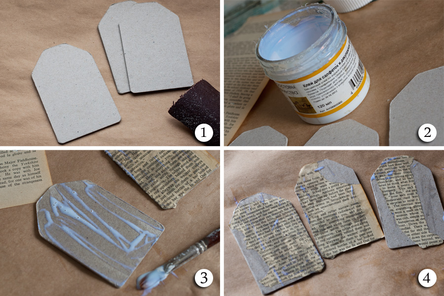 2-3-4. Приклеиваю на картонную основу пожелтевшие книжные странички, использую для этого декупажный клей (можно заменить акриловым лаком или клеем ПВА). Клеем промазываю сначала саму основу, потом сверху приклеенную бумагу (как в декупаже). Отправляю заготовки сушиться на батарею.