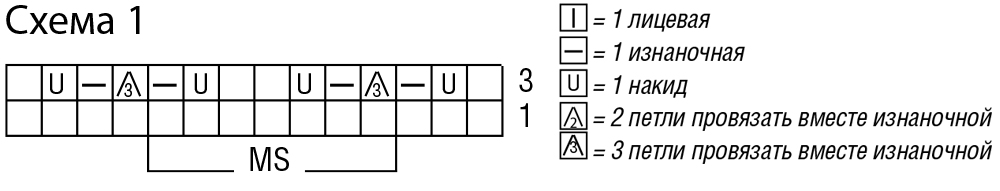 Число петель кратно 7 + 2 кромочные = вязать согл. схеме 1. На ней даны только лицевые ряды. В изнаночных рядах все петли и накиды провязывать изнаночными. Начать с 1 кромочной и петель перед раппортом, раппорт постоянно повторять, закончить петлями после раппорта и 1 кромочной. Постоянно повторять 1—4-й ряды.