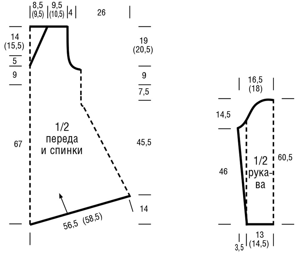 Размеры на выкройке частично получены при измерении модели. В высоту эти размеры постоянно получены в направлении вязания = стрелка.