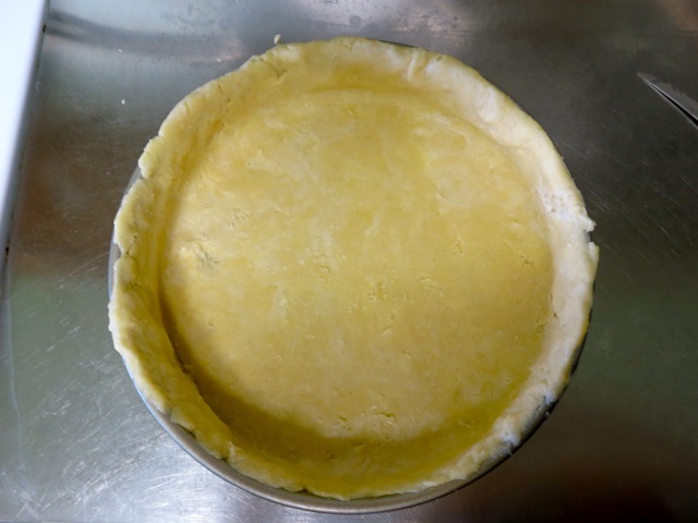 Аккуратно переносим тесто в форму для пирога. Подравниваем борта.