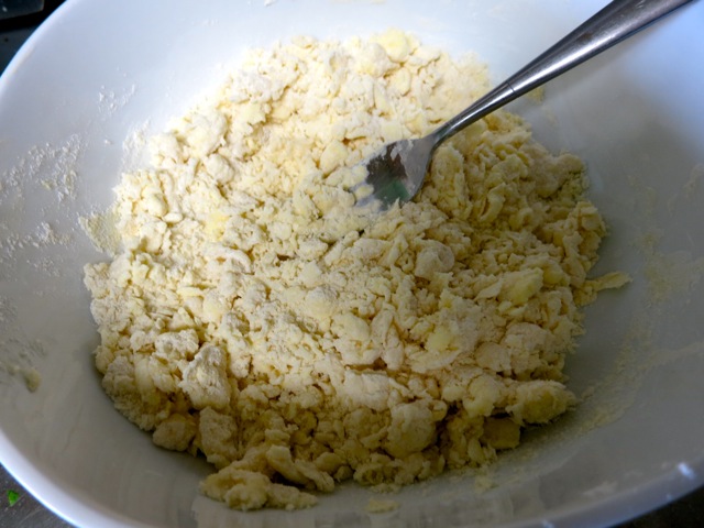 Кладем жир в миску с мукой. Вилкой размельчаем комочки жира; смешиваем жир с мукой до состояния жирной крошки, в которой кое-где попадаются кусочки жира размером с горошину.