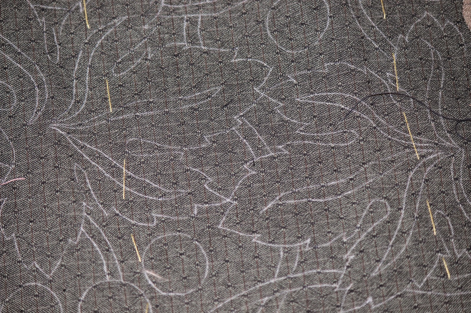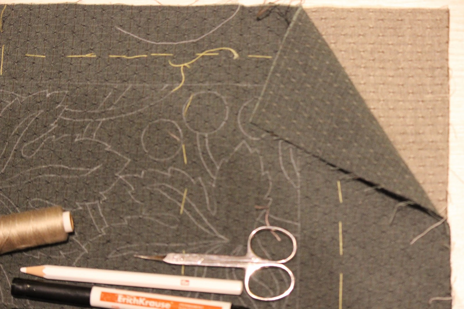 Так перевелся рисунок. можно использовать белый карандаш для ткани. Он на фото есть. Держится белая переводка хорошо, но я все равно с ней осторожно обращаюсь.
